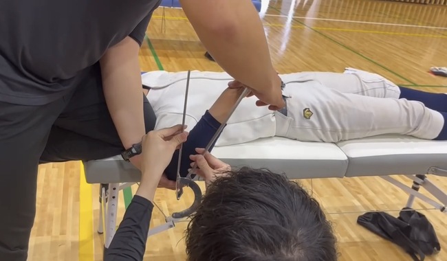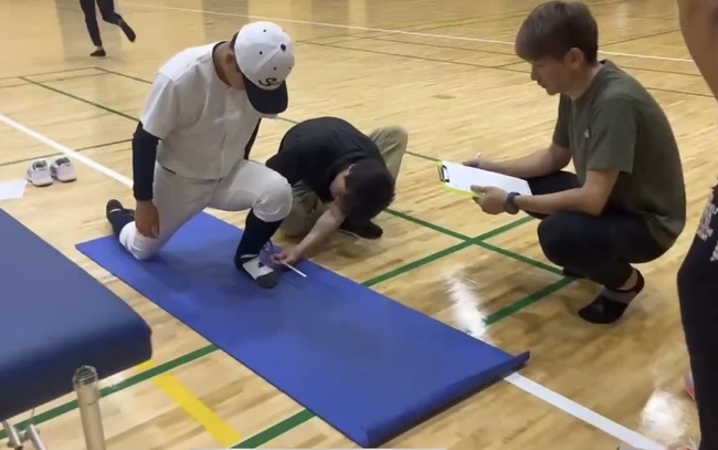 さらに、理学療法士を中心としたリハビリスタッフが、投球動作に欠かせない上肢(肩や肘など)や下肢(股関節、足首など)の関節の柔軟性や可動域を細かくチェックしました。体の硬さが原因でフォームが崩れ、肘に負担がかかっていないかなど、障害予防につながる評価を行いました。