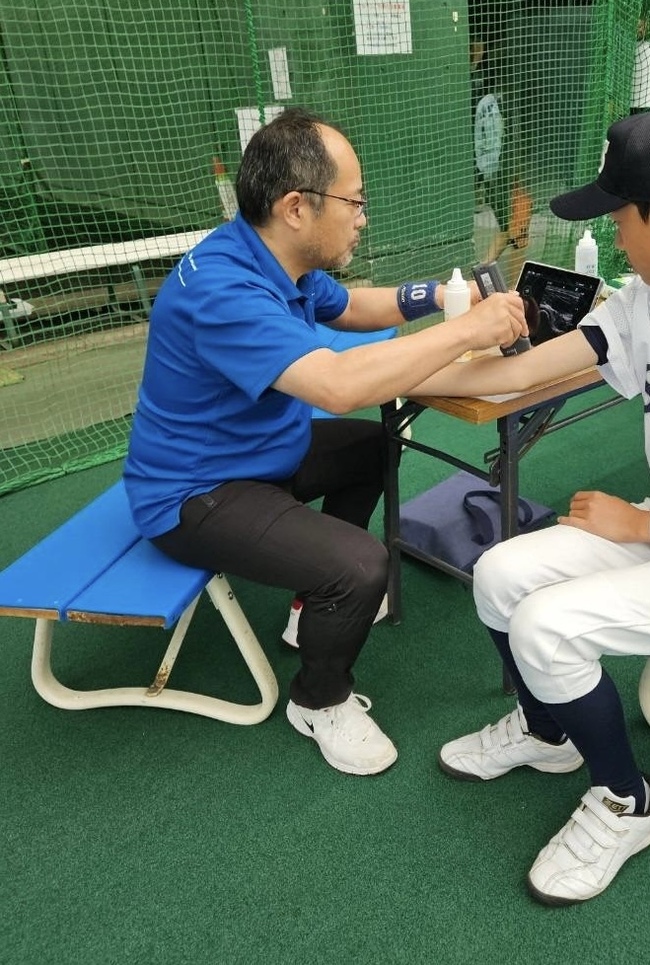検診では、整形外科医師による肘関節へのエコー(超音波)検査を実施しました。 これにより、レントゲンでは分かりにくい骨や軟骨、靭帯などの微細な損傷や炎症の有無を詳細に確認し、将来的な野球肘のリスクを早期に発見することに努めました。